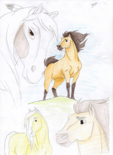 Nice pic. I just have one constructive critisism. I know Spirit's mane and tail are dark, so it's easy to think they are black. However, one the DVD extra "learn to draw Spirit" James Baxter (Spirit's artist) used and said to use a dark, chocolate brown for the mane and tail.