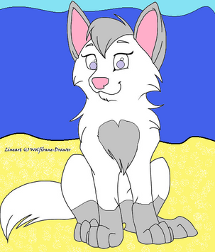 I imagine this one as a female. she's white, though half of her body is "liver" spotted thanks to Never, and the other is black spot thanks to Risk! also has a silver tinge to her underbelly and tail, and she also shows a slightly tinged mask around her eyes. blue eyes thanks to her father!