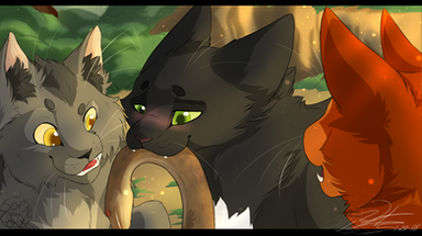 Longtail, Bramblepaw, Sandstorm, Graystripe, Darkstripe, Speckletail (in far back), Cloudtail, Brightheart, Tawnypaw, and Dustpelt