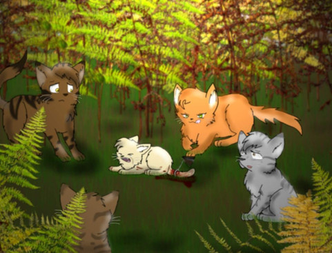 I decided to read Bluestar's prophecy again, cause why not?I used this scene where Tigerkit and the other kits were playing near the medicine den and Goosefeather freaks out.Β