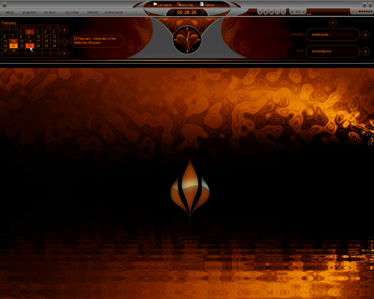 This is a 1280 x800 fullscreen theme with a wave motion desktop by virtue of an html element.The motion can be stopped/started just by clicking on the html part of the screen.Also availiable is a 1280 x 1024 version for desktop pc's..The 'on' button of the amp is set to the command 'run_winamp'.I have to say that this nevers works for my pc nor indeed does 'winamp.exe' so if you are like me you may wish to re-command this button to the actual .exe file..Simply right click on it and select 'properties'.