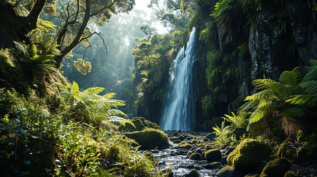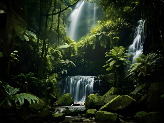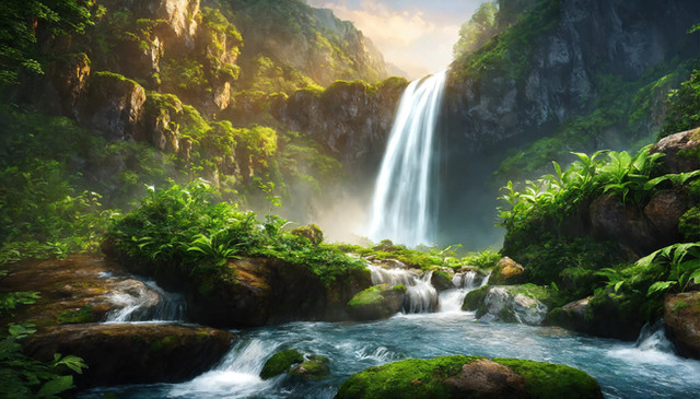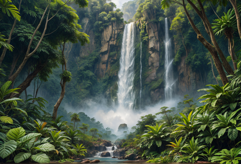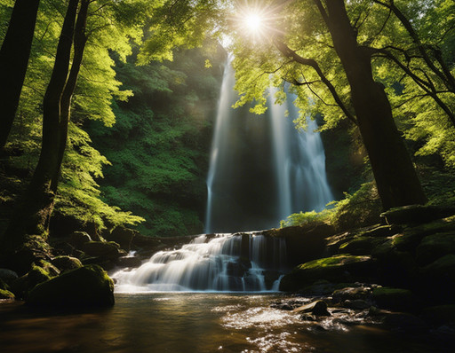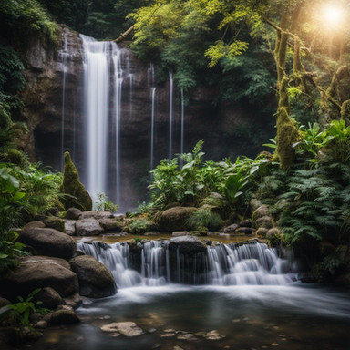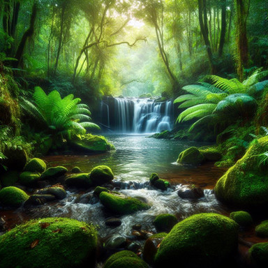 In the heart of this forest, a waterfall emerges as the centerpiece. Crystal-clear water flows smoothly over a rocky cliff, cascading down in a gentle yet steady stream. The sound of the water is soothing, merging harmoniously with the soft rustles of leaves and occasional birdsong.
