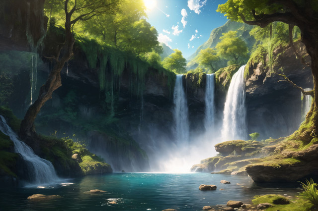 Below the waterfall, a tranquil pond forms, its surface reflecting the surrounding greenery and the bright blue of the sky peeking through the tree canopy. The edges of the pond are fringed with an array of floraβferns, flowering bushes, and maybe even some wildflowers adding splashes of color to the green tapestry.