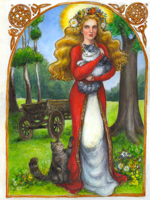Freya is the goddess of love and fertility in Norse mythology, and she is associated with sex, lust, beauty, sorcery, gold, war, and death. Here she works seiðr, Norse magic, while wearing her prized necklace Brísingamen and surrounded by symbols of her power and her beloved cats.