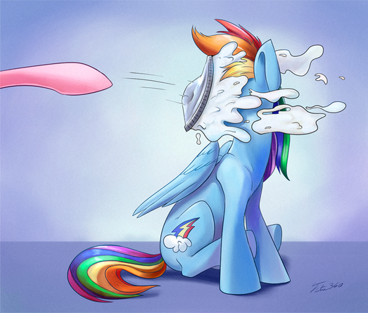 This is a wonderful piece of art! I love how her mane and tail is wet, and the way she is half lifting it off and her innocent expression. Although I do think her eyes could show a little more expression. Her eyes have matched the ones from the show nicely. Use of shadow and 3D is splendid. Her mouth and nose are very cute. I absolutely love it! Rainbows wings look very nice, too. It would've been nice to have water dripping off her or just a little drop sliding down her chest or back. I am not a very good critic, but I can say this is an excellent picture.