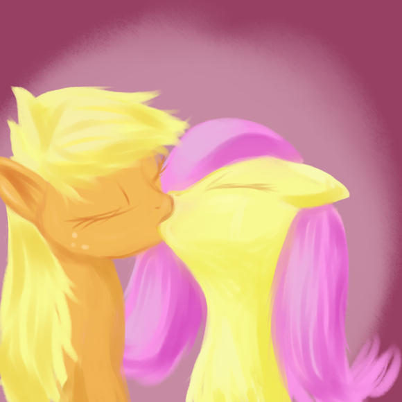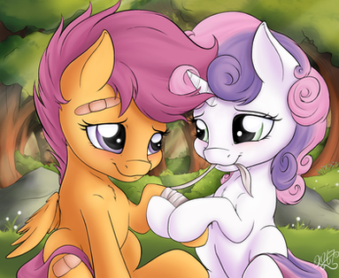 Scootaloo's heart brakes at the failure. She lays her head in her hooves on the table. "No... that's not what I..... Oh never mind." She lays her head there in frustration and slight embarrassment. Then suddenly she feel the soft warm touch of two gentle lips on her cheek. She lifts her head up to see Sweetie Belle smiling at her.