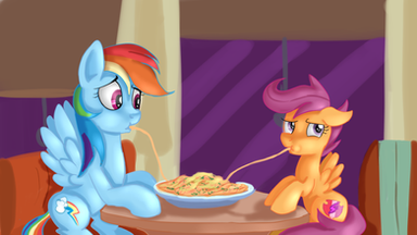 Scootaloo looks admiring the view as Sweetie Belle slurps in a long spaghetti noodle. Her eyes focus in closely to her small pink lips as the noodle gently glides by. She turns away lifting her hoof up to her mouth and slightly blushes at the though of those lucky noodles. Then a spark of an idea crosses her mind.