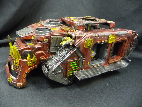 The Warboss takes a puff of his cigar as he taps a bit of the starboard side of the Battlewagon. "Somefin' ain't roight 'ere...." He takes another thoughtful puff, the smoke wisping through his yellowed teeth. "It's Orky but it ain't Orky enuff... Da boyz c'n joust make soumma dem Lemun Rust tankz Orky wit' dah rusty stoiyle and dah patchwourk, but dis looks fresh...." He puffs again through his teeth. "Fresh catch, dis one? Dem Space Marine boyz keep dere tings in gud shape. Godda drill in and get dem hardah Orky met'ls ontah dat ting!" He takes another puff, the smoke wisping round his head and away, his mouth twisting into a grin. "Dat'll happ'n when it'z seem some GREAT foightin'! Good job, yah Mekboy!"