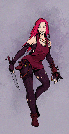 Love her, somewhat sexy, yet she seems a little desperate. Maybe she's calming herself down after a kill or something. Well that's how she comes off to me.