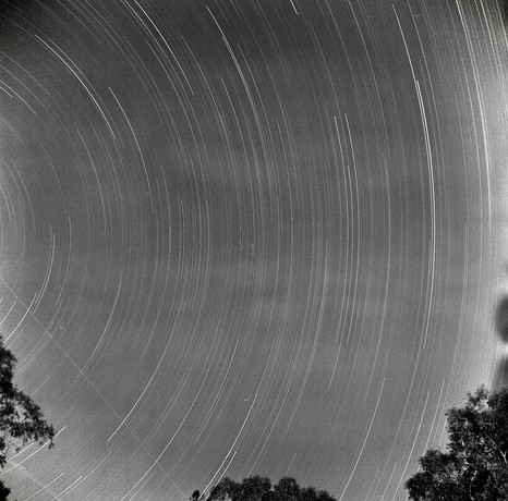 The Milky Way stretched over Wild Horse Mountain lookout. The lights in the bottom right are from Brisbane, reflected on the clouds.