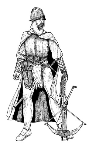 A young arbalester (crossbowman) in my ongoing low-fantasy pseudo-medieval RPG campaign.Took reference from some pics on the internet for the gambeson and crossbow itself.