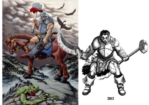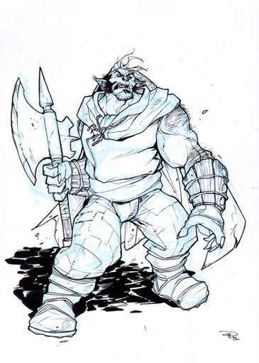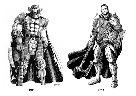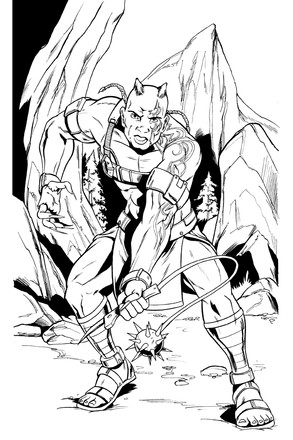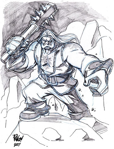 For this redesign I felt the original look of the character was still cool, but he looked too much handsome and his body, although exaggerated in anatomic features, still was too well-proportioned. I always imagined Mothar as being a solid 200+ pounds of muscle in a pocket package, being only about 4' 5" high. So I wanted to give him this hunched feature reflecting his impossible physical proportions.