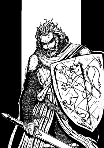 Thanks for the input and nice critique. You're right, the sword was designed as the last part and using a photo-reference of a "flat-bladed" one, but the final result was not that satisfying and the blade seems now too much flat without the chanche of giving it to give it the right perspective in a b/w lineart.