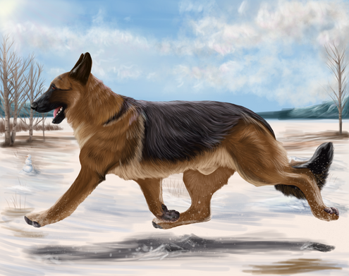 Even with the blurring, there is still a significant amount of detail contained within the background. Rather than blobs that are supposed to be blurred trees, you have, particularly on the right hand side of the image, trees that are blurred. You can tell what they are, despite the blurring. The paw-prints in the snow are also a lovely touch. Which brings me to the highlight of the picture, the highly detailed pictures of the dogs. The amount of fur detail is incredible, from the fuzz on the back of the legs to the way the tufts of hair flow about on the neck to the stray hairs on the ears. It speaks volumes about the effort, work, and care put into this piece.