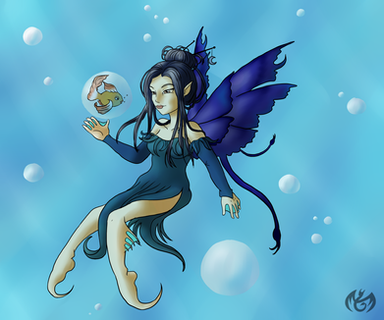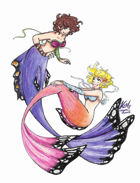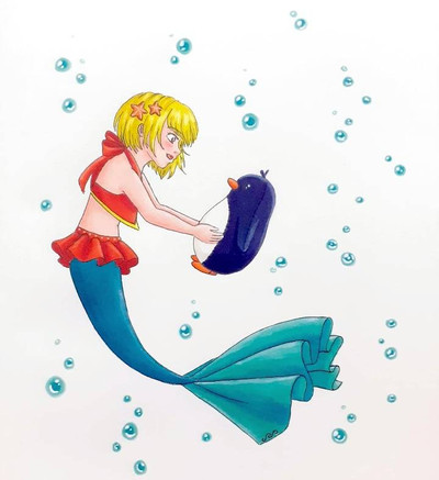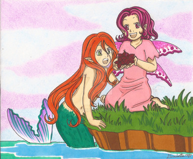 I like the background you chose for this piece and the chic looks cute, I'd like to see more of this character. She looks lively and all around fun. Your merboy seems kind of surprised he's small and in human hands. I feel you did better with this piece as far as his body shape goes.