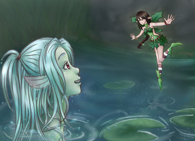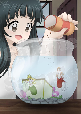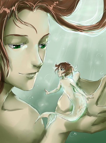 lol oh my this picture messed with my head a little cause the background is perfectly placed and when i scroll it looks like the background stays in place and the picture moves i was like O_O how did she do that!?!? but then i realized i was being stupid <_< but in all seriousness, i really love your art and i love the look on the tiny merman's face its adorable. your art is so cute ^^ nice work