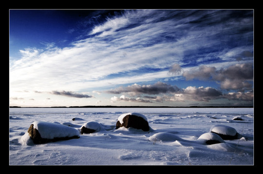 Hi everyone! Here's a photo manipulation I did last night. The sky photo was taken yesterday at the afternoon from my window, and the photo of the field late in the evening just as the sun was about to set (just outside Porvoo in Finland). I would not have been "forced" to combine two shots if there had been clouds in the sky when I took the misty field photo. The sky just looked so bland without any clouds, and this field was so special it just couldn't be left unused.Print available.