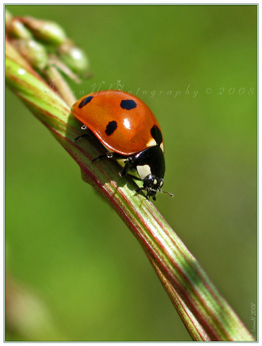 Wonderful photo! The ladybug seems so alive, and close...like I could touch it. The border you chose goes well with the colors. Nice work!