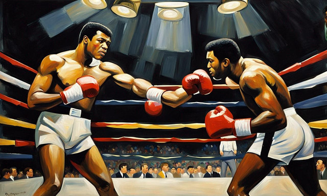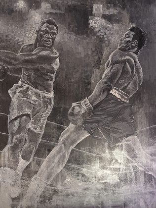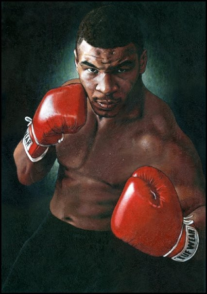 This original painting features Muhammad Ali and Mike Tyson in the fight we all wanted to see. Painting is size 50 x 32 inches and is now sold. Painted with acrylics and on canvas. Limited Edition prints are available, limited to 250 prints size 12 x 10.50% of the sale of the prints will go to Leukemia Research.