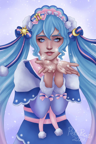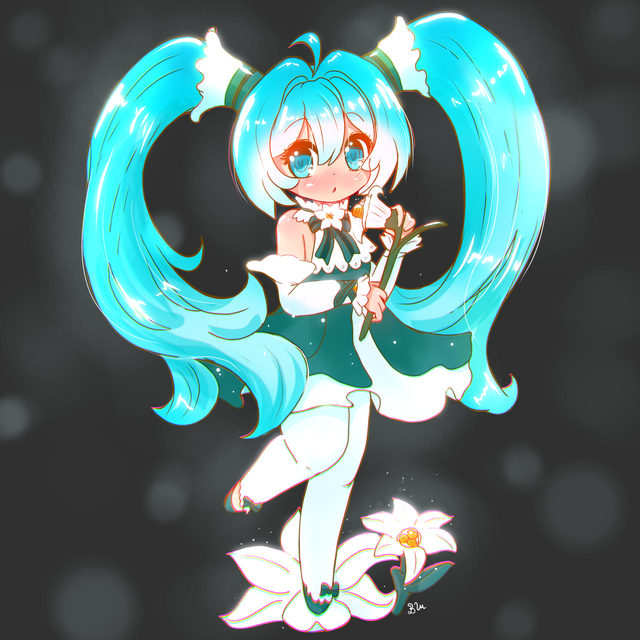 I chose to draw the 2015 module because it has always been my favorite Snow Miku design! It’s pretty simple and yet soft and really cute (and has more colors than the other designs!!) ~ Those white rounded bell shaped flowers on her pigtails have always stood out to me ever since I saw them when she first came out, it’s my favorite part of her design really! I believe that they look wonderful against the green parts of her outfit 🌱💙