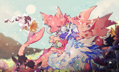 My friend's character Mentanoia and my character Almond out picking flowers!it's the least crowded spring festival activity, and since Menta hates crowds and Almond gets awkward around too many dragons they decided to go flower picking together :]
