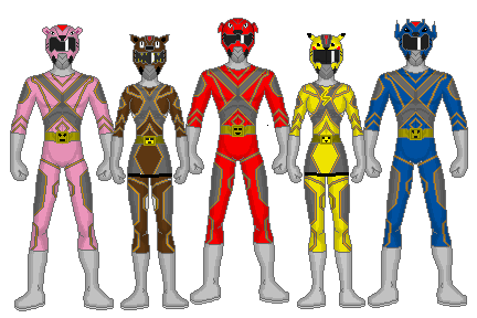 Request from TeiOuja. I was asked to create a team based on creatures from the Redwall series. The core five are red fox, yellow badger, blue mouse, black hedgehog and white wildcat. Their suits are inspired by leather archer's armor. The sixth ranger is the pink hare and his suit is based on the military coats of the hares in the series. Each ranger has a shield crest with a symbol representing a different element.Red Fox = wind