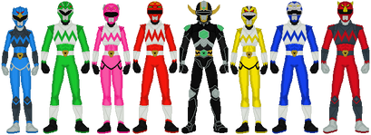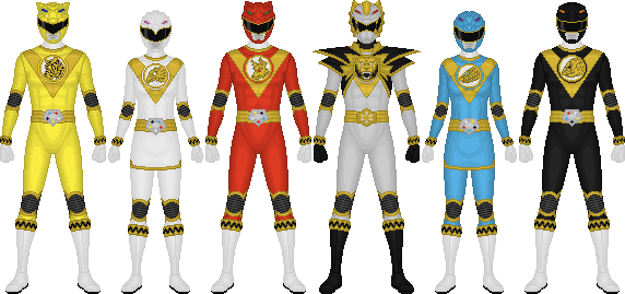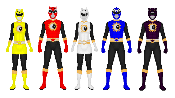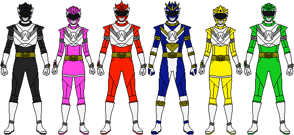 Request from NeoduelGXThe suits are a cross between Lost Galaxy and Wild Force with Mighty Morphin' style helmets. The result ended up having an Aztec/Mayan vibe with all the angles and diamonds. At least that's what I think. Just like Wild Force had a different number of stripes for each ranger, these rangers each have a different number of bands within the center diamond (except for the sixth ranger which has three bands on each side diamond). Each ranger also has a power gem embedded in their suit.