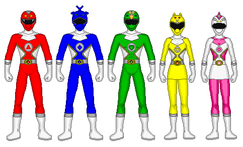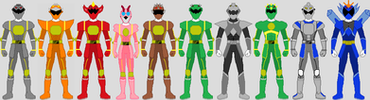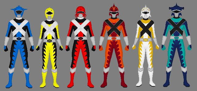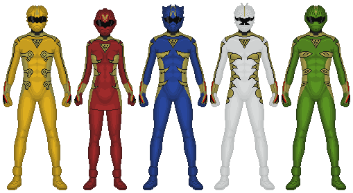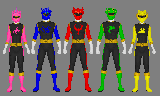 Request for Retahensid. I was asked to create a team based on different kinds of lizards (and in the case of the salamander, a lizard-like amphibian). He also specified that tails be abstractly integrated into the design.The girls have leotards as opposed to the now standard skirt. The main parts of the suits have a mesh like armor resembling scales. I incorporated the tail designs into the left arm of each ranger, trying my best to mimic the tail of the actual lizard each ranger represents.