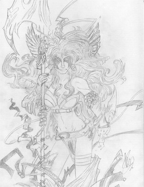This summer , Michael Turner left us . This amazing artist , gave me the will to be a drawer myself . I know i am not as talented as he used to be , i know i will never be , but , i wanted to make something for him . I will draw Sarah Pezzini , but for the moment , i have made this little squetch of Darkness ' ennemy , the Angelus .Michael Turner was , as we say in France :"Un Monsieur" (more than a Great man) , and for me a genius .