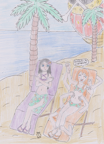 Cindry looks perfect, and I love how her...crap it's not called a scarf..umm..feather thing..I think a boa...ANYWAYS! it looks awesome as it goes over her body, which a very nice job on perspective in general in this picture! And I like how the feathers from said boa are what Perona is using to tickle her! Plus Cindry looks great smiling and laughing, a shame she could never do it more. Not to mention a great job coloring her as well. Such a lovely shade of blue!