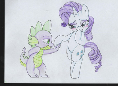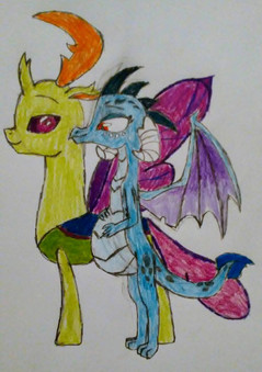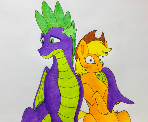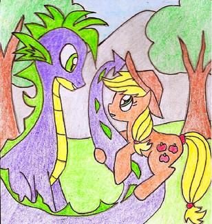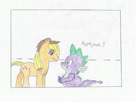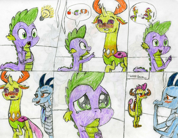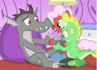 A few days in...AJ and Spike knocked on the door to Ember’s cave. She answered, then invited them in. In the living room, they found Therma (AKA Thorax the Pregnant Dragoness) sitting on a couch, reading a book. Her belly had grown to the approximate size of a basket.