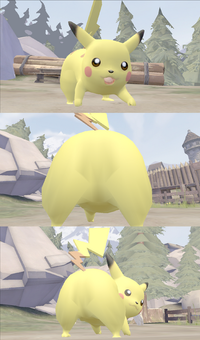 A giant female Pikachu is showing Charizard her butt.Related content