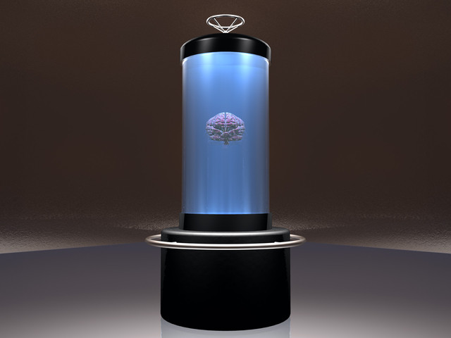 Done Completely in Bryce 5. 2 lights in each tank with one light using a light Gel. Brain was an imported model I found on the net. 100 megabyte file rendered in 7.5 hours @36 Rays per pixel - Superfine antialiasing on an AMD 2100+check out my other Bryce Stuff [link]