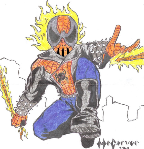 Borrowed lineart from ([link] ), holy crap that guy has a good sense for depth. Look at how that damn chain wraps around the picture like that!Almost "Gotham" looking, ain't it? Hehe, couldn't help it. I'm new to the Darkness, never really followed him (but saw a few pictures) so excuse me if the coloration is off (though I do like his two-tone color hair). Ghost Rider, shit, he doesn't need explination, he's like Chuck Norris with a flaming head and a hell-cycle. I wonder what poor bastard's about to be jumped by this unholy duo?