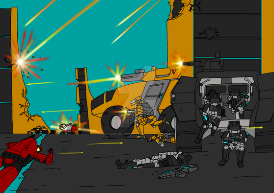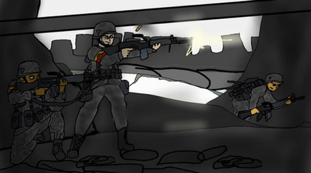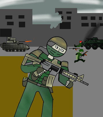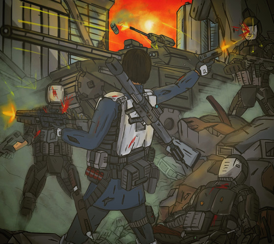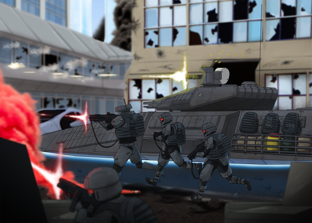 A rebel position is *literally* overrun by an enemy MBT.During the Eraxton Civil War, urban warfare was a common sight. Unfortunately for rebel forces, they were both poorly equipped and trained to deal with government forces. This often resulted in desperate close quarters combat, with rebel forces being left spread apart and unable to properly support each other. Ironically, this actually aided rebel forces since government forces would often end up surrounded on all sides by accidentally moving straight into the middle of a rebel line.