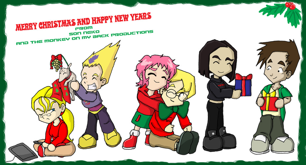 Well here is the Xmas card from my Flash Cartoon for you're viewing pleasure. Why is Odd always picking on me? And I'd also like to say that the cartoon this belongs to would have been made a lot faster if my darn wacom tablet wasn't a piece of slag! Who would have thought that you could wear out a wacom from constant use in less then a year! I guess that's why I'm cross in the picture... that and the mistletoe. Well anyway thanks for watching my cartoon!Related content