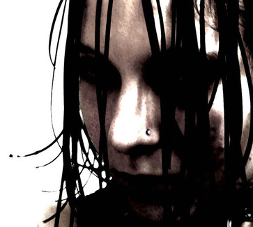 all the white space surrounding the image really helps to create a contrast with the darkness of the image, not only in terms of colour, but also (what seems like) a black eye and bleeding lip.