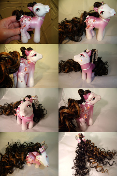 Her hair was rerooted and put into a ponytail. For her bangs, I drilled extra hair holes and shaped them with super glue (On the roots) and gloss finish sealer.