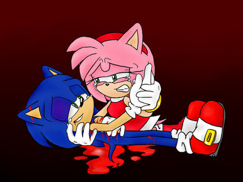 Sonic's bleeding on Amy's shoulder from a cut on his arm he got keeping her safe and she's crying cause she's worried? I dunno. XD But it's well-drawn and kinda cute, whatever happened. Actually, this picture makes me wanna draw that out now for some reason. Weird....