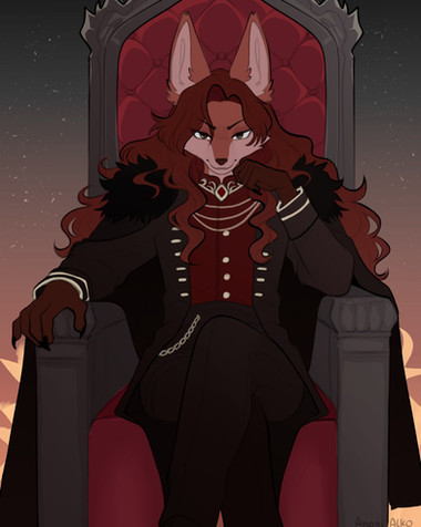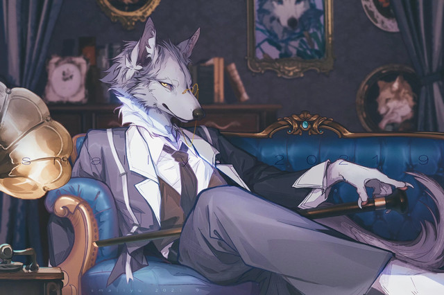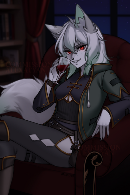 #anthro #canine #female #furniture #sitting #solo #wolf #wine_glass #fully_clothed #narrowed_eyes #smiling_at_viewer #desk_room