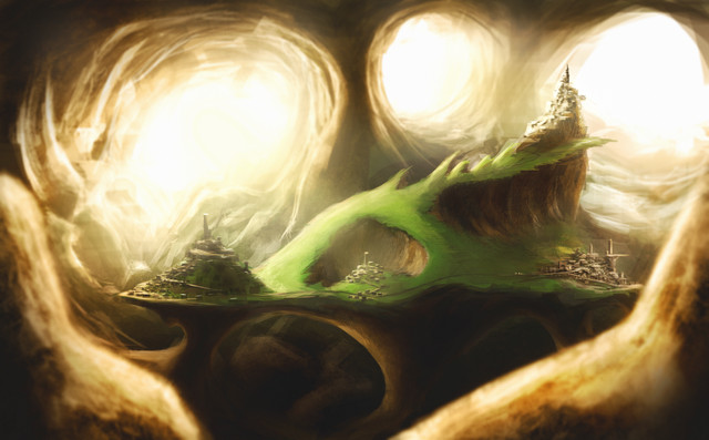 I love floating worlds too and this one is fantastic! I love the mood set by the darker colors and the details you added. This is a really great piece