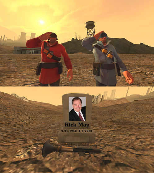 On 4/12/2020, the voice actor for Soldier from Team Fortress 2 passed away thanks to covid-19. This is my tribute. I started working on this as soon as I heard that he died. Later today (4/14/2020) I'm going to play TF2 and play as solder because Rick May, the voice of soldier, died to the coronavirus.May his soul rest in peace