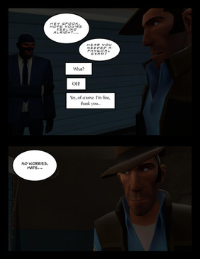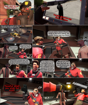 I started working on this not long after I made part one. I guess I just lost interest in it or maybe I didn't have any ideas? I can't remember right now, either way, it's out and Demoman's face in that last panel is killing me! XD And just to let you guys know, no, I'm not feeling all that much better, maybe because it hasn't been long enough for the medicine to fully work.Anyway, here's a link to part one!