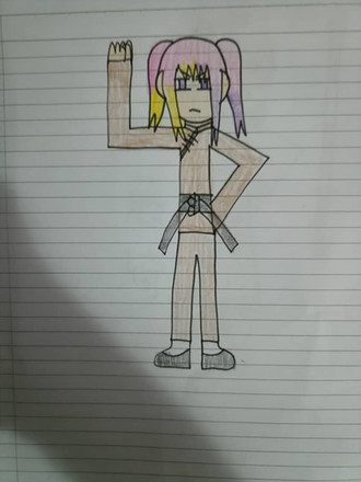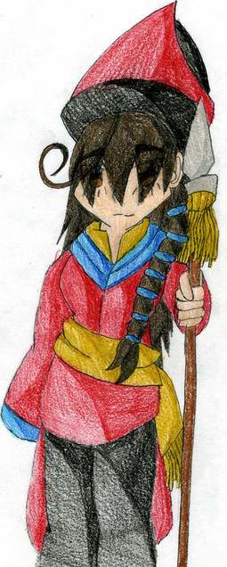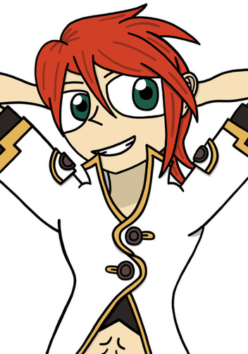 Appearance: Long brown hair, purple eyes and wears a red uniform that reaches his thighs, two white straps over his body, white gloves, black boots.