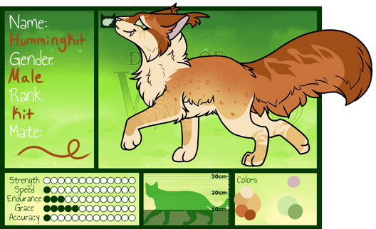 • Rabbitstar was actually named after Rabbittail, her grandmother. However, as she grew, or well.... aged (since she hardly grew at all) she definitely grew into her name, er, aged. She has a very rabbit like appearance, large ears, very slender, lithe body, very wide bright eyes. Her pelt is a fiery orange and copper, with thick black marbled brown tabby stripes and her eyes a forest green. Alright, alright, and though it's a ouch subject her size is very similar to that of a rabbits... aka she's very small in stature, but just don't tell her I said it. It may be the truth, but i'd rather like to keep my tongue as a working part of me, and she's pretty, well extremely, sensitive about that.