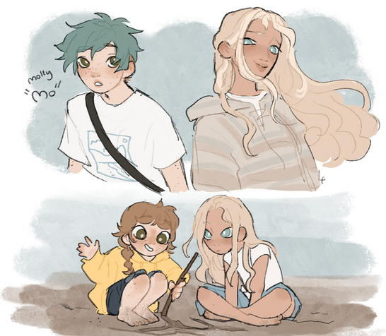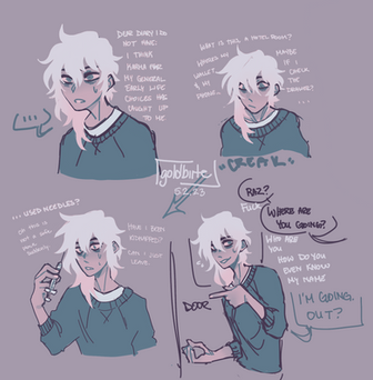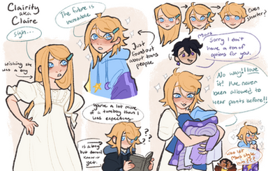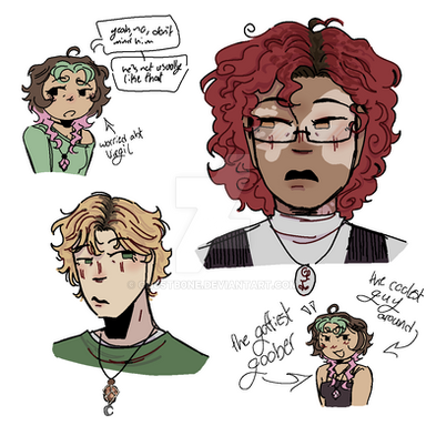 Unfortunately having an Adult present in his life again did not stop him from being an idiot with magic, as about 3 years into his friendship with skid he started experimenting with the book again and fucked himself up. He's not entirely sure how he fucked himself up, but his magic is super janky now, he's developed a lot of memory issues after the accident, and he's also mostly blind. Worst of all he's immortal at 15 and he doesn't even know how to fuckin undo it so he's in a permeant state of Puberty. But hey at least he has Skid/Claire who can commiserate with him in that regard.