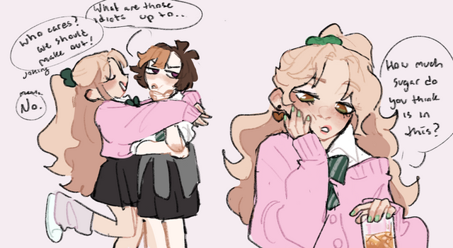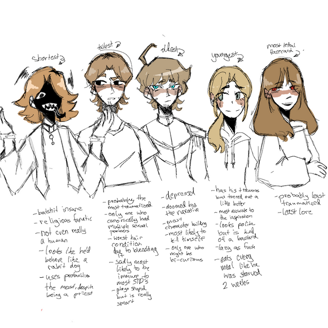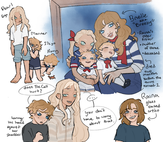 was thinking about how Claire is actually kind of a menace and unafraid to speak her mind and do things her own way. Because the gang knows so little about her outside of the brief moments they do get, as well as the way Skid tends to talk about her. The gang's general impression of who Claire is as a person is wildly different from how Henri (and Skid too tbh) see and know her to be.Henri's backstory is that when he was 11 years old his parents were hunted down and publicly executed for "witchcraft". While most the claims were falsified the truth behind it was that they'd been looking into a cult and uncovered some information they shouldn't've. They left this knowledge in the hands of their 11 year old son, who obviously taught himself how to read ancient greek in order to decode what the fuck was in this scrapped together book that his parents had DIED for. He learns a bunch of dark magic, as well as how to summon a demon and also how to expel a demon from a human body. You can see where this is going. After booting skid, Claire was absolutely fuckin Pissed at him. She threatened to kill a good several times(and he's a lil freak so he fell in love with her over this and he remains in love with Claire even once Claire comes out as trans) and the two spent a good six months together tracking down Skid again(who was playing pirates and briefly dated a hydra during that six months). Even after Claire and Skid were reunited Henri decided to stick around, and Skid loves strays so they were more than happy to have a little sidekick.