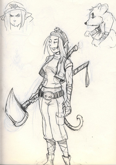 A super sketchy ref of Rynn. This was something I was doodling while watching the election returns last night. I wasn't going to post this version but ~Inxanity got all puppydog-eyed on me, so I had to post something. Maybe I'll do a better version later....yeah, right!Anyways, I made a few changes from her Fading Heavens from, but nothing major. No more vest, and she has short sleeves now. Rounded the hammer a bit, and the handle is shorter, but I'm not sure if I like it yet.