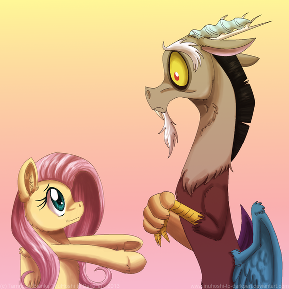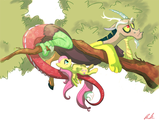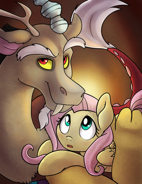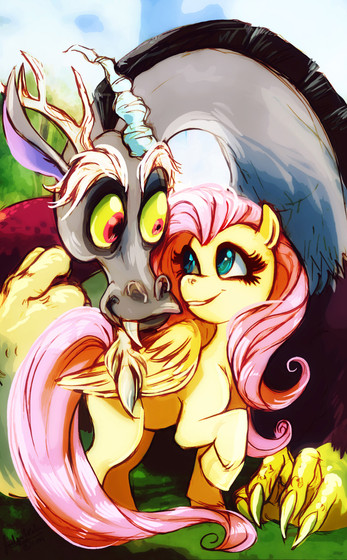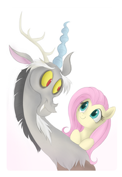 They both look SO adorable! Fluttershy is so sweet and innocent! =3 And Discord actually looks sweet, too!
