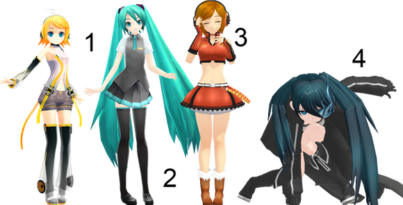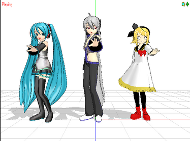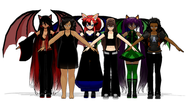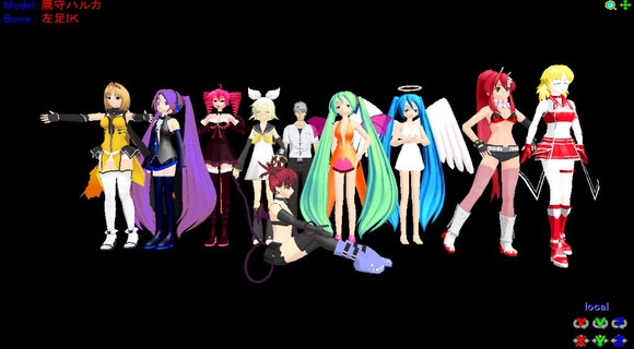 Okay, so clockwise we have here my furry self-model, self model, possible-UTAU-model if I ever get around to playing with that program, and the iModel that would go with it. Also, my furry model, pretending she has a working tail. After that is my self model with Cthulu wings.Across the bottom is the MMD group (Mieko, Rin, Kaito, Miku, Haku, Len, and Neru) recolored as iModels (are you coming to realize I like iModels?).
